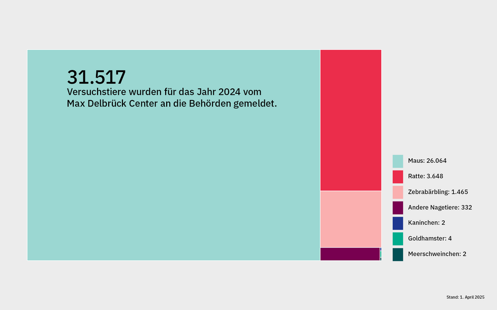 Am Max Delbrück Center setzen Forschende Mäuse, Ratten und Zebrabärblinge (das ist ein anderer Name für Zebrafische) in Tierversuchen ein. Außerdem gibt es am Max Delbrück Center eine kleinere Kolonie von Nacktmullen, die ebenfalls der Forschung als Modelle dienen. In der Statistik sind diese unter den „anderen Nagetieren“ aufgelistet. Die Kaninchen, Meerschweinchen und Goldhamster leben am Max Delbrück Center für die Schulung von Auszubildenden in der Tierpflege. Kaninchen werden außerdem für die Herstellung von Antikörpern gehalten und am Ende des Versuches an die Labortierhilfe abgegeben.