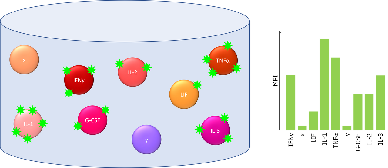 In the multiplex approach, the targeted proteins are immunologically coupled to color-labeled beads. The use of classification lasers (bead lasers) and reporter lasers enables the simultaneous identification of proteins and their respective quantification. The laser optics ensure highest precision and data density of the measurements.