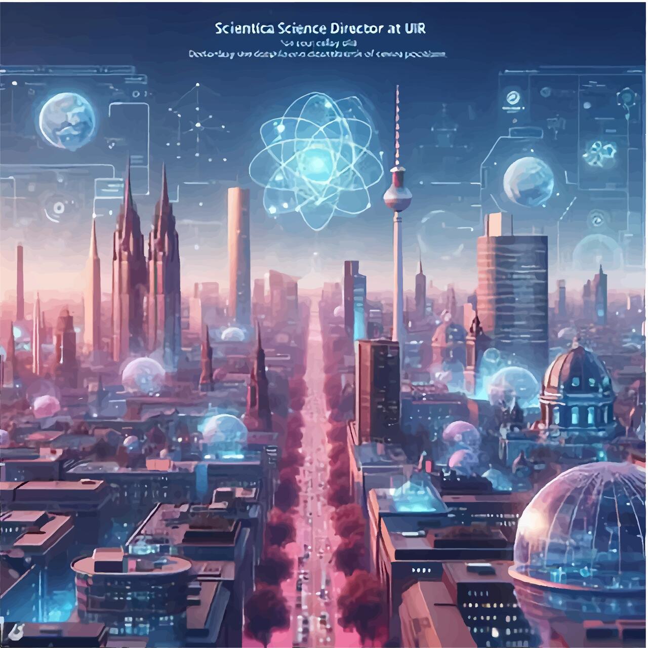 Erstelle mir ein Bild einer wissenschaftlichen Stadt in der Zukunft in blau/rosa Tönen nach folgende Vorstellungen: