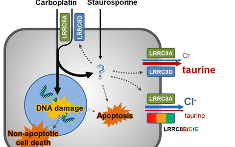 Die Chemotherapeutika Cisplatin und Carboplatin sowie der proapoptotische Naturstoff Staurosporin gelangen in kleinen Mengen durch passive Diffusion über die Plasmamembran in die Zelle. Die Platin-basierten Wirkstoffe induzieren DNA-Schäden, die zu nicht-apoptotischem Zelltod und – in geringerem Umfang – zu Apoptose führen; haben aber auch eine mechanistisch bisher schlecht verstandene direkte proapoptotische Wirkung. VRACs werden wiederum durch proapoptitische Stimuli geöffnet. Durch LRRC8A und LRRC8D gebildete Kanäle transportieren hauptsächlich zelleigene Osmolyte wie Taurin, dienen aber auch als zusätzlicher Weg für die Aufnahme der Platin-basierten Wirkstoffe, aber nicht für das größere Staurosporin. Cis- und Carboplatin befördern somit ihre eigene Aufnahme in die Zelle über die Aktivierung von VRACs. (Abbildung: Thomas Jentsch, FMP/MDC)