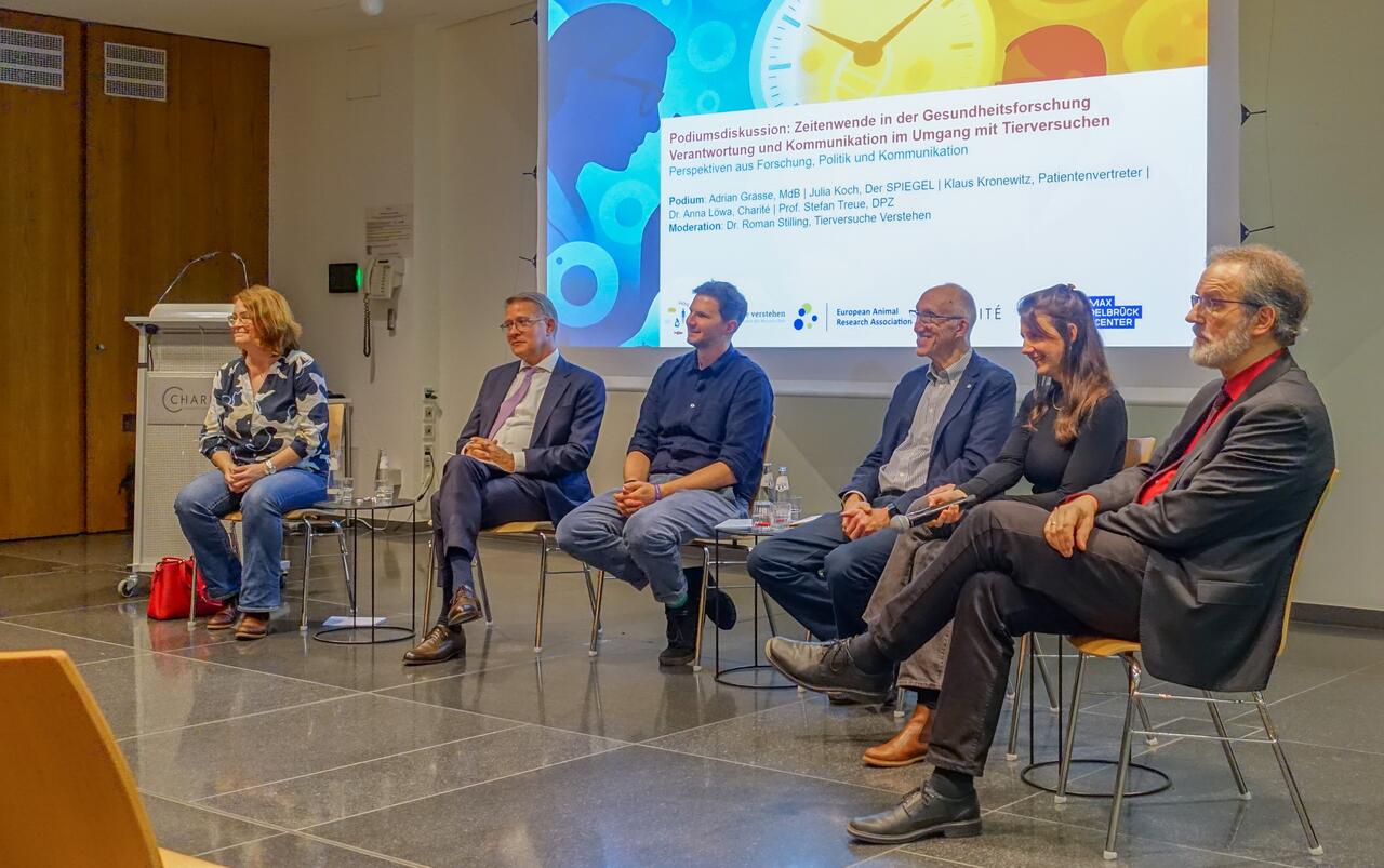 Transparenz und Dialog sind keine Add-ons, sondern Teil guter wissenschaftlicher Praxis. In diesem Punkt waren sich die Anwesenden einig auf der Podiumsdiskussion „Ein Wendepunkt in der Gesundheitsforschung: Verantwortung und Kommunikation beim Einsatz von Tieren in der Forschung“. Eingeladen hatte die Initiative „Tierversuche verstehen“ der Charité – Universitätsmedizin Berlin und des Max Delbrück Center. Julia Koch von DER SPIEGEL sprach über die Verantwortung von Wissenschaftsjournalist*innen, Nachrichten aus Labors nicht überzubewerten, sondern darauf hinzuweisen, dass alternative Methoden noch immer Grenzen hätten und dass Studien an Mäusen nicht eins zu eins auf den Menschen übertragbar seien. Von links nach rechts: Julia Koch, DER SPIEGEL; Adrian Grasse, Mitglied des Bundestages (MdB); Roman Stilling, Tierversuche verstehen; Klaus Kronewitz, Patientenvertreter, Nationales Centrum für Tumorerkrankungen (NCT) Berlin; Dr. Anna Löwa, Charité; Stefan Treue, Deutsches Primatenzentrum (DPZ).