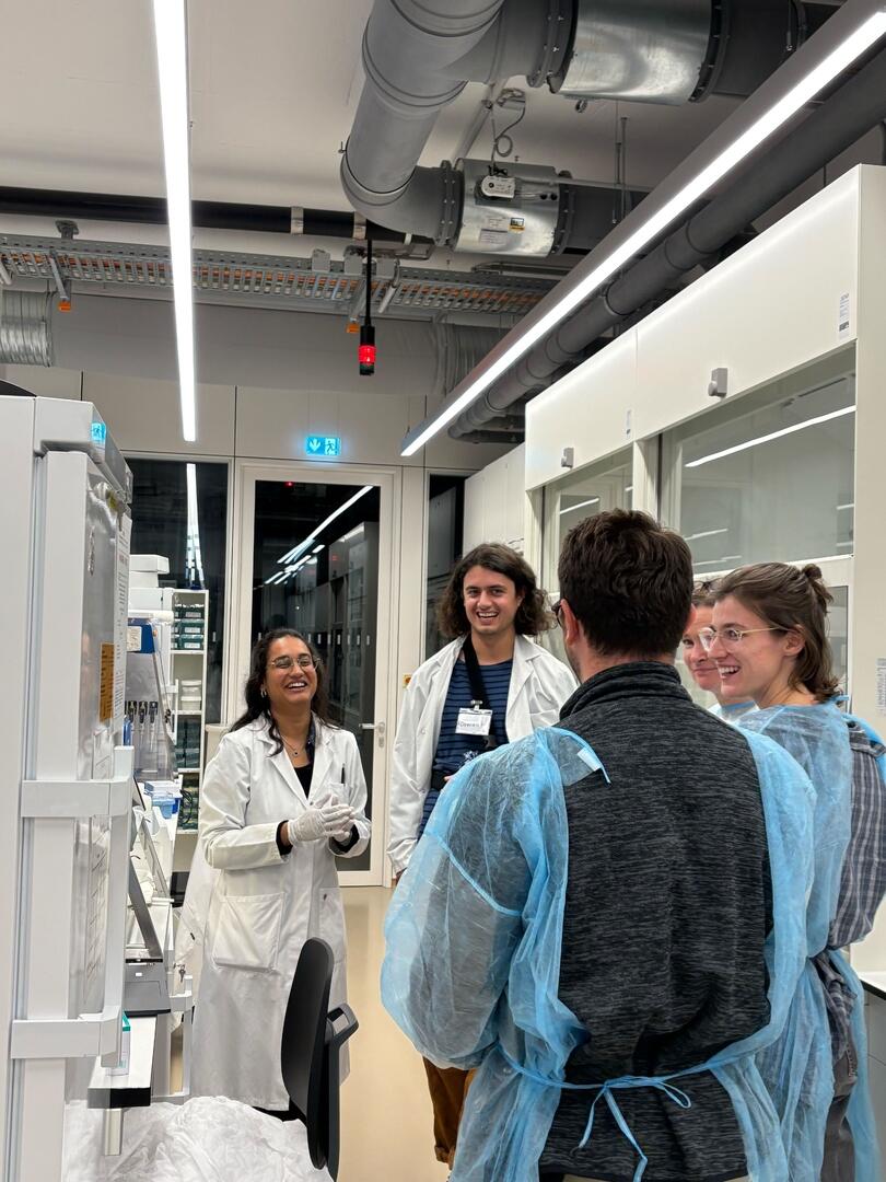 © Viktoria Flore, Max Delbrück CenterSoniya Shende (links) und Benedict Monteiro (rechts) führen durch das Labor von Ashley Sanders und zeigen, wie Forschende des Max Delbrück Center mithilfe von Einzelzelltechnologien untersuchen, wie Organe und Gewebe entstehen, wie wir gesund bleiben und was Krankheiten auslöst. Zudem konnte man erfahren, wie maschinelles Lernen und Data Science Wissenschaftler*innen helfen, Millionen von Messungen auszuwerten und zu verstehen.
