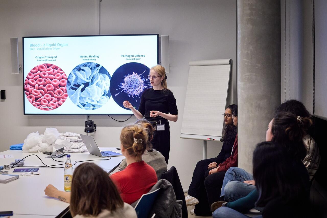 © Viktoria Flore, Max Delbrück CenterForschende des MDC-BIMSB hatten die Besucher*innen dazu eingeladen, sich eine Zukunft jenseits der Gegenwart vorzustellen – eine Zukunft, in der das Verständnis für einzelne Zellen neue Möglichkeiten für die Vorhersage, Prävention und Therapie von Krankheiten eröffnet. In einer Einführung stellte Viktoria Flore aus dem Labor von Simon Haas die Bestandteile des Blutes vor und erklärte, welch wichtige Rolle jeder einzelne davon für die Gesundheit und bei Krankheiten spielt. Weiße Blutkörperchen sind beispielsweise für die Wundheilung und die Abwehr von Keimen verantwortlich. Auch Krebs lässt sich mit ihrer Hilfe bekämpfen.