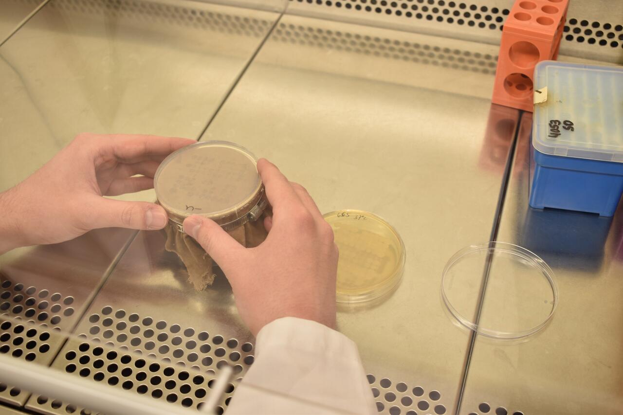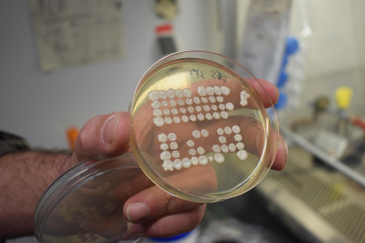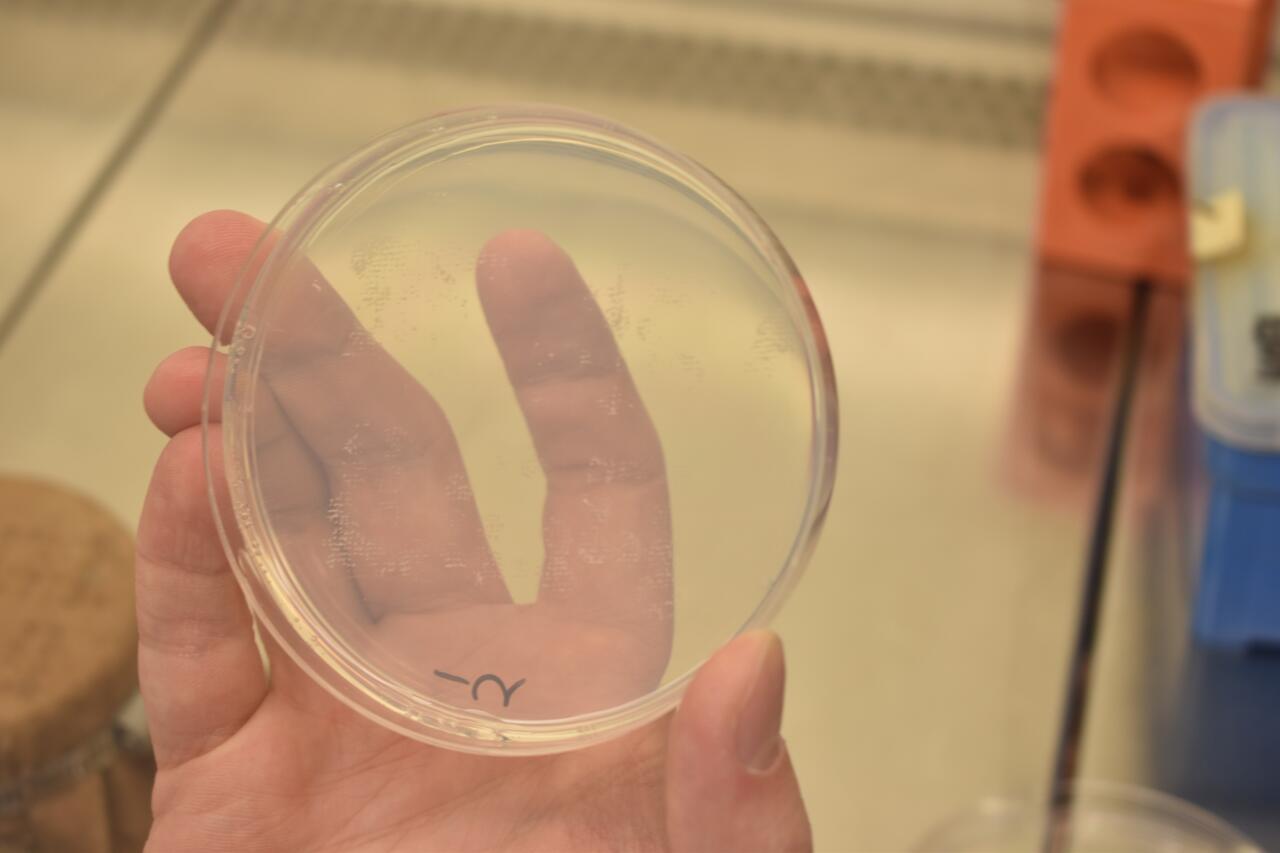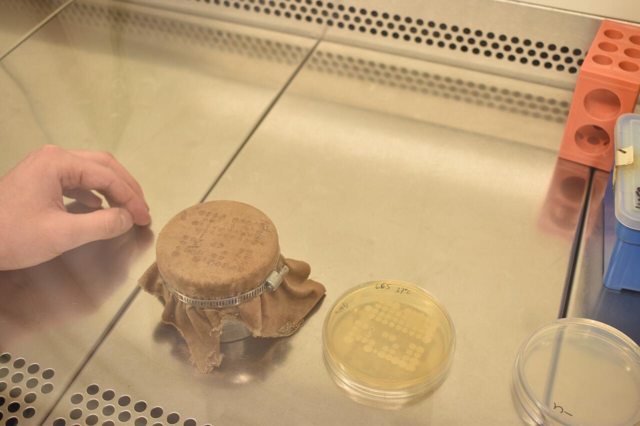Der Wissenschaftler und seine Kollegen nutzen die Samtzuschnitte, um Mikroorganismen von einer Platte mit Nährboden auf eine andere zu übertragen. Auf diesen Platten wachsen Hefepilz-Kolonien, deren Gene sich voneinander unterscheiden. Besitzt eine Kolonie ein bestimmtes Gen, kann sie auf manchen Nährmedien wachsen, auf anderen jedoch nicht. So ein Gen kann der Hefe zum Beispiel eine Resistenz gegen ein bestimmtes Antibiotikum verleihen. Ist dieses Antibiotikum dem Medium zugesetzt, wachsen darauf nur die Hefen mit dem passenden Resistenzgen .