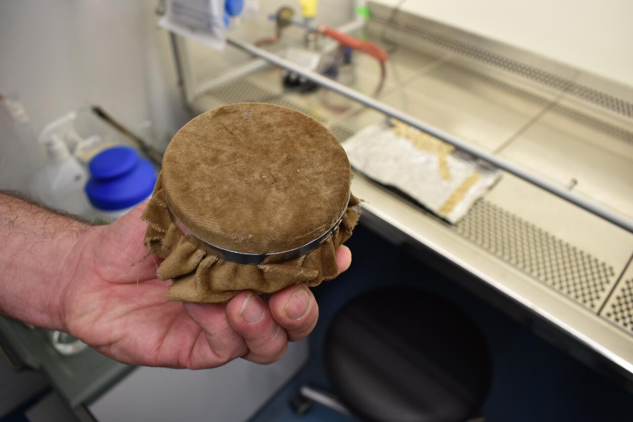 Behutsam streicht Ernst Jarosch über das bräunliche Stück Stoff, das aus seiner Aluminium-Verpackung lugt. Es sieht ein wenig verschlissen aus, an den Rändern sind einige durchgewetzte Stellen erkennbar. „Unsere Samtstücke werden regelmäßig gewaschen und autoklaviert, das hinterlässt auf Dauer Spuren“, sagt der Forscher aus der Arbeitsgruppe von Thomas Sommer. Gut möglich, dass die Samtzuschnitte, die in seinem Labor genutzt werden, zu den ältesten verwendeten Laborutensilien des MDC gehören. Corinna Volkwein, die technische Assistentin der Arbeitsgruppe, hat den Samt vor 24 Jahren in einem Stoffladen erstanden.