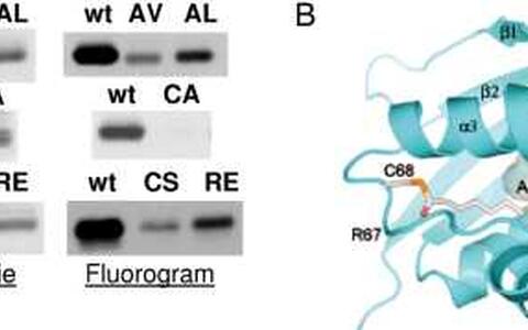 Palmitoylierung der TRAPP Untereinheit Bet3 an Cystein 68. (A) Gleiche Mengen GST-Wildtyp Bet3 und Mutanten mit dem Austausch der Reste A82, C68 bzw. R67 (links) wurden mit [3H]-Palmitoyl-CoA inkubiert. Das Fluorogramm (rechts) zeigt das die Palmitoylierung absolut von der Anwesenheit des Cysteins an Position 68 abhängt und durch die kanalblockierende Mutation an Position 82 oder Ladungsumkehr an Position 67 deutlich reduziert wird. (B) Die Palmitoylkette ist in einem tiefen Kanal im Inneren von Bet3 gebunden, was durch die Einführung von sperrigen Seitenketten an Position 82 verhindert werden kann. Aus Kümmel et al. (2006) Proc. Natl. Acad. Sci. USA 103, 12701 – 12706.