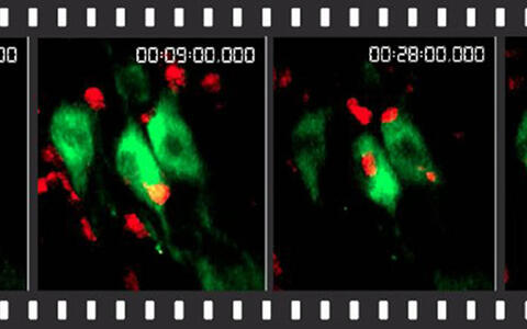 Immune cells (red) attack nerve cells of mice. This leads to lethally elevated calcium levels within the neurons. (Photo: Dr. Volker Siffrin/Copyright: MDC)