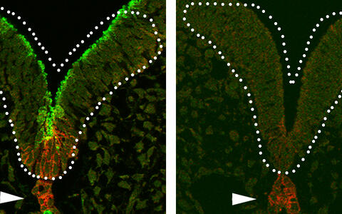 The dashed line marks the region of the neural tube out of which the forebrain develops. There in mouse embryos, a binding site (lipoprotein receptor LRP2) (green) for cholesterol is normally found (left image). This binding site plays a key role in the development of the forebrain. The signaling molecule sonic hedgehog (SHH) (red) arises from the structure marked with the arrow below the neural tube (prechordal plate) and accumulates in the overlying neural tube. Therefore a red signal is also visible in the forebrain structure. In mouse embryos in which the gene encoding LRP2 has been inactivated (right image), SHH is produced in the prechordal plate (arrow), but the signaling molecule does not accumulate in the overlying marked forebrain structure. The LRP2 receptor is lacking (no green signal). The researchers conclude that not only cholesterol is important for the activation and distribution of the signaling molecule SHH, but that also a lipoprotein receptor LRP2 is required in the target field to enhance the signal molecule. (Photo: Annabel Christ/ Copyright: MDC)