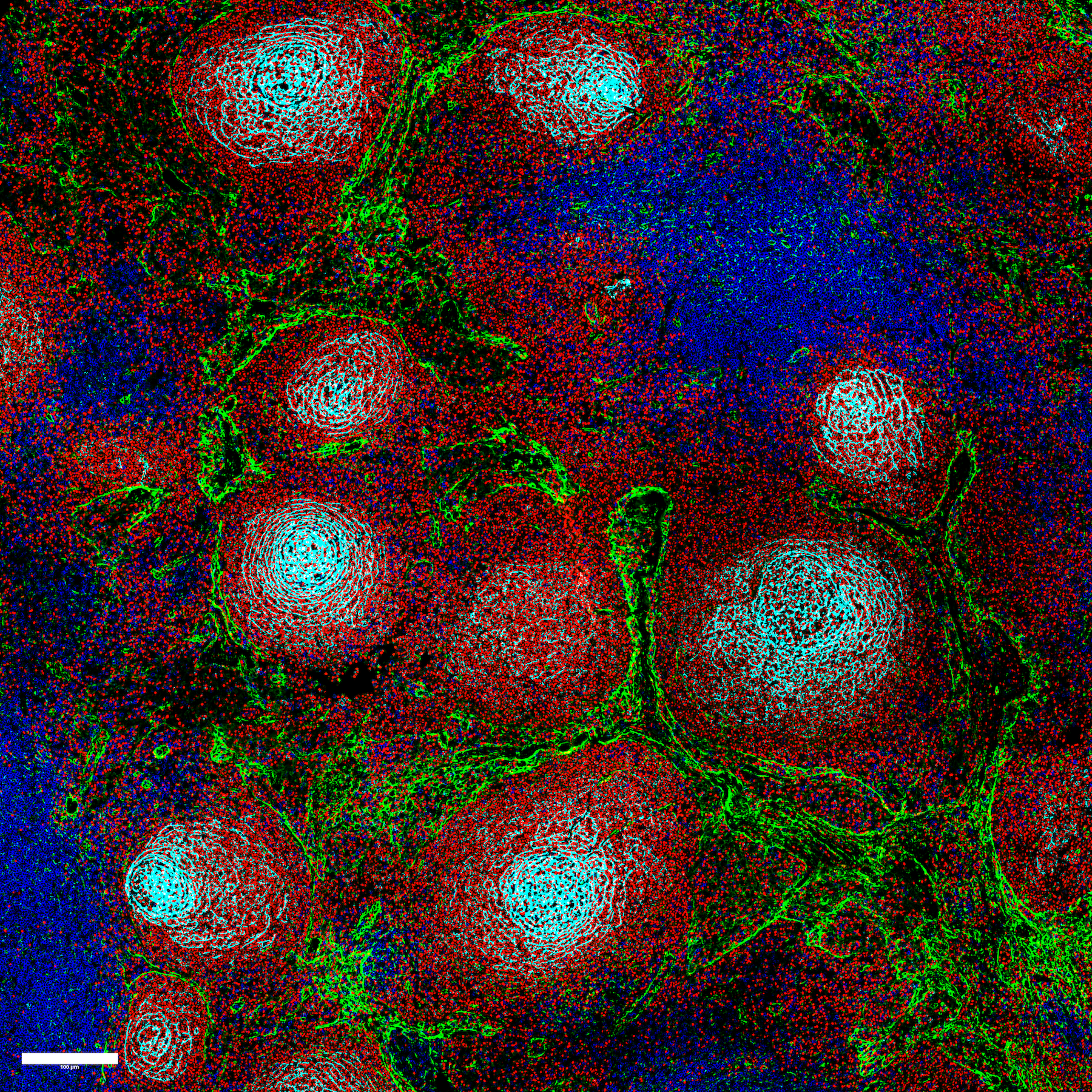Lymph nodes are highly organized command centers of the immune system. Within these structures, immune cells gather information about invading pathogens or abnormal cells and coordinate a precise defense response. This finely tuned collaboration enables the body to fight infections and cancer effectively. Crucial to this success is spatial organization: distinct immune cell types occupy defined zones within the lymph node and carry out specialized tasks. This complex tissue architecture forms the foundation of an effective immune response.