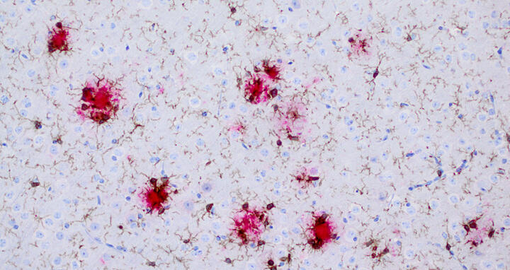 Immunzellen des Gehirns, die Mikroglia (braun), scharen sich um Amyloid-beta- Ablagerungen (rot) in einem Alzheimer-Mausmodell. (Photo: Frank Heppner/ Copyright: Charité)